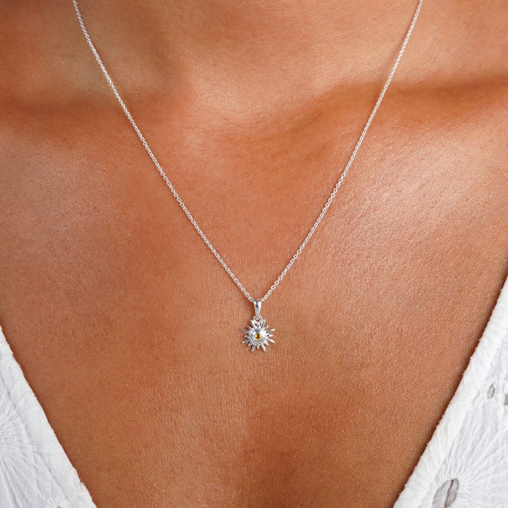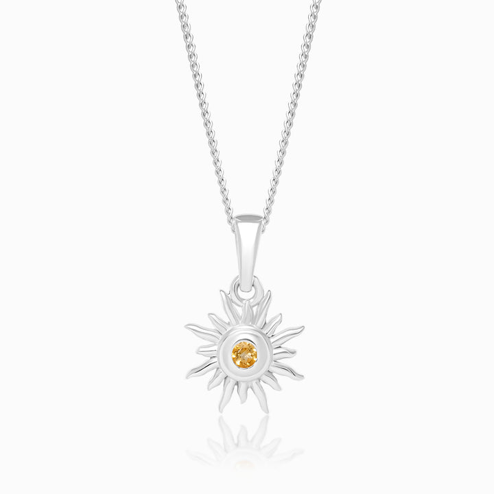 Berlock Sol med Citrin i Sterling Silver 925. Gör ett komplett halsband genom att köpa någon av våra silverkedjor. Solen symboliserar överflöd, värme och styrka. Du är en del av solen och bär denna berlock som en påminnelse om din inre lysande kraft. Solens symbolik tillsammans med kristallens energier gör smycket väldigt betydelsefullt och vackert.