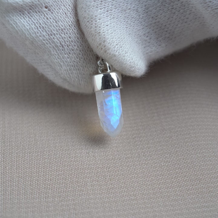 Stilren berlock i silver från Cielo Crystals, med en kristall av månsten formad till en spets – passar både till vardags och fest.