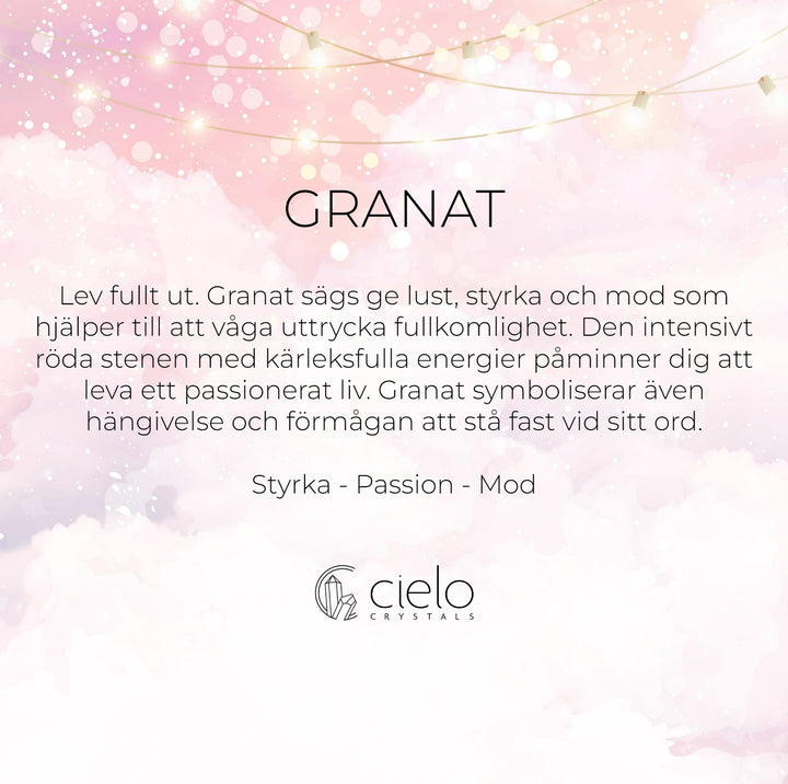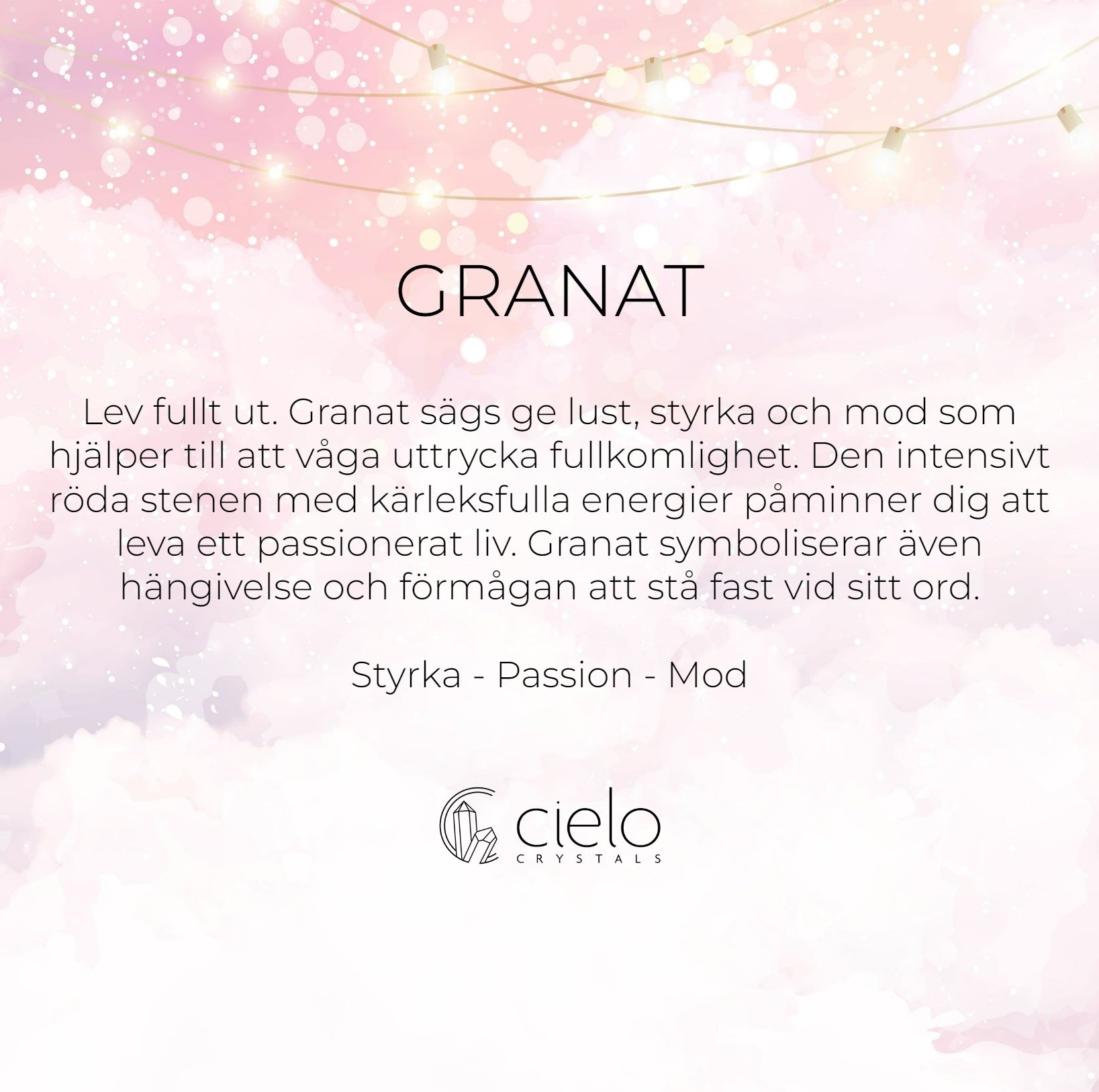 Lev fullt ut. Granat sägs ge lust, styrka och mod som hjälper till att våga uttrycka fullkomlighet. Den intensivt röda stenen med kärleksfulla energier påminner dig att leva ett passionerat liv. Granat symboliserar även hängivelse och förmågan att stå fast vid sitt ord.