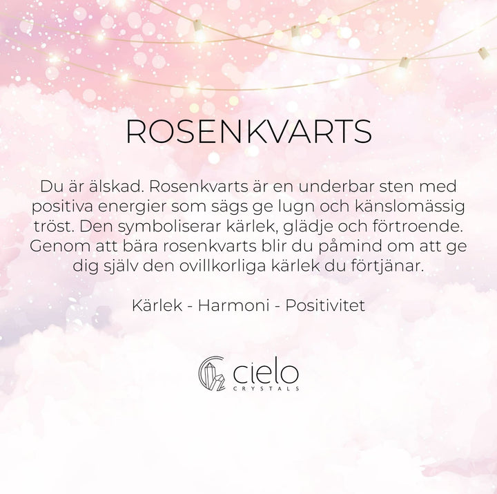 Du är älskad. Rosenkvarts är en underbar sten med positiva energier som sägs ge lugn och känslomässig tröst. Den symboliserar kärlek, glädje och förtroende. Genom att bära rosenkvarts blir du påmind om att ge dig själv den ovillkorliga kärlek du förtjänar.