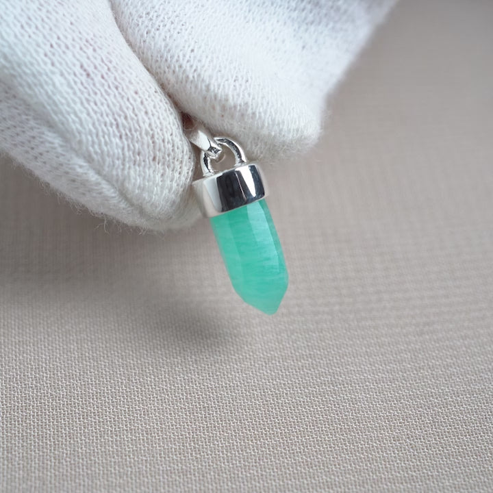 Gör ett komplett halsband genom att köpa till någon av våra silverkedjor. Söt minispets i Amazonit som är perfekta att kombinera med andra kristallhalsband. Med detta smycke bär du alltid med dig din favoritkristall.