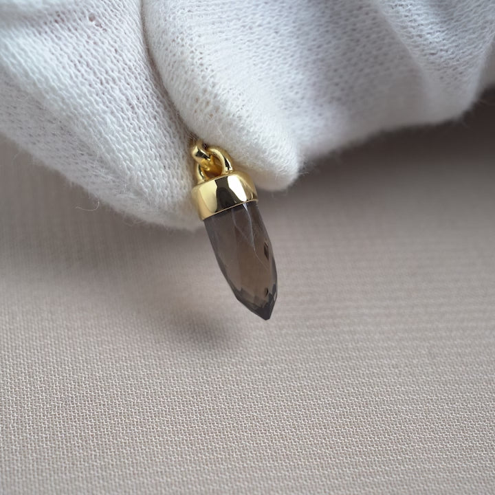 Minispets med Rökkvarts i 18k Guld Vermeil. Ett kraftigt lager av äkta guld över Sterling Silver, fritt från mässing och tungmetaller. Resultatet är ett smycke som strålar av både skönhet och högvibrerande energi. Gör ett komplett halsband genom att köpa någon av våra guldkedjor. Söt minispets i Rökkvarts som är perfekt att kombinera med andra kristallhalsband. Med detta smycke bär du alltid med dig din favoritkristall.