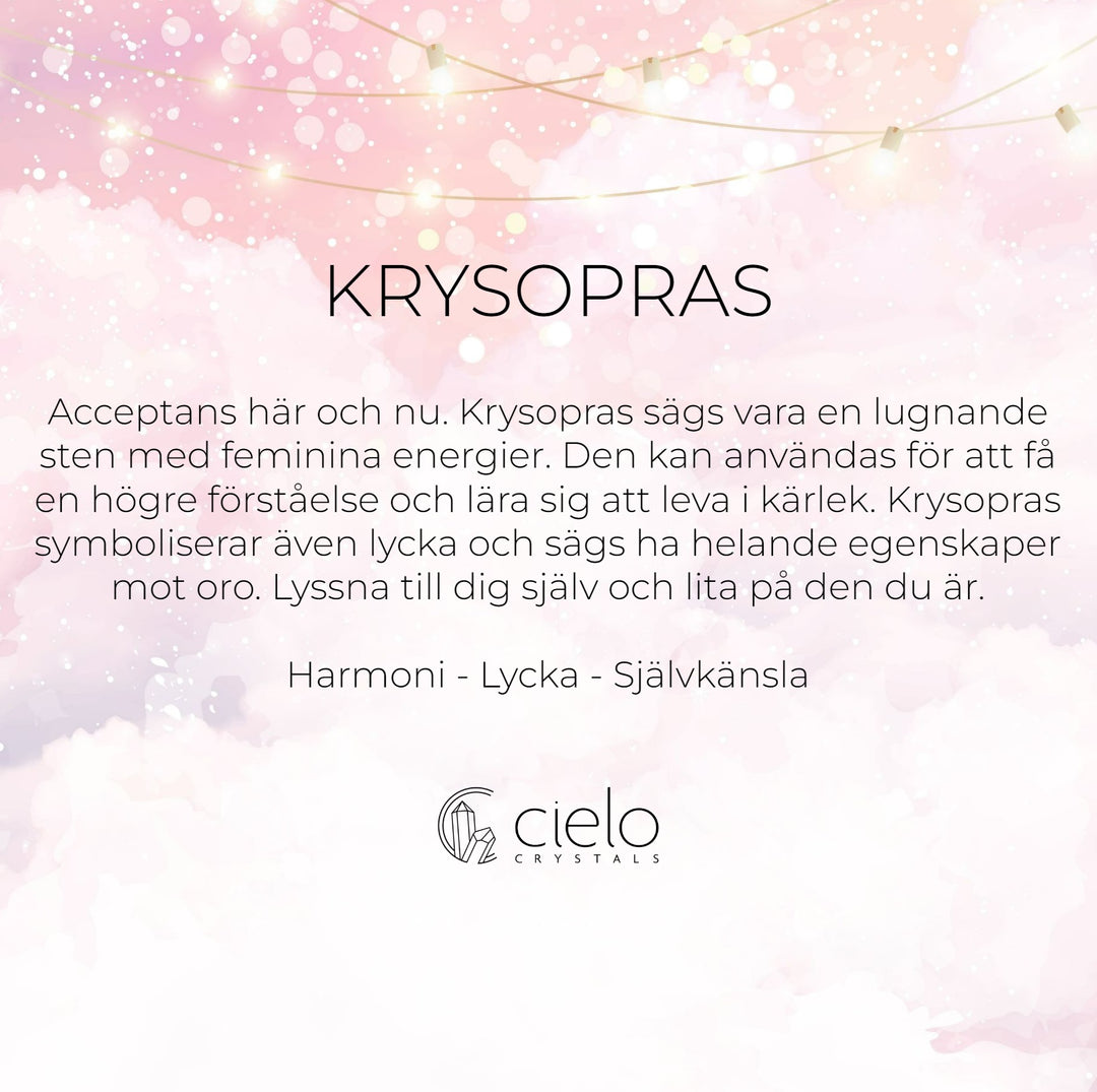 Acceptans här och nu. Krysopras sägs vara en lugnande sten med feminina energier. Den kan användas för att få en högre förståelse och lära sig att leva i kärlek. Krysopras symboliserar även lycka och sägs ha helande egenskaper mot oro. Lyssna till dig själv och lita på den du är.