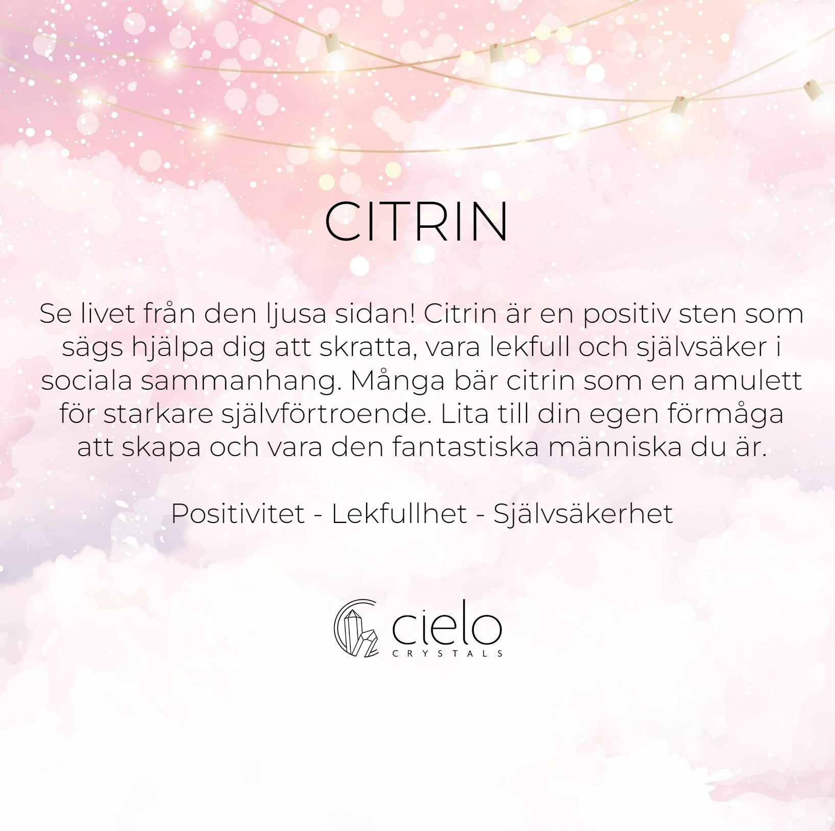 Se livet från den ljusa sidan! Citrin är en positiv sten som sägs hjälpa dig att skratta, vara lekfull och självsäker i sociala sammanhang. Många bär citrin som en amulett för starkare självförtroende. Lita till din egen förmåga att skapa och vara den fantastiska människa du är.