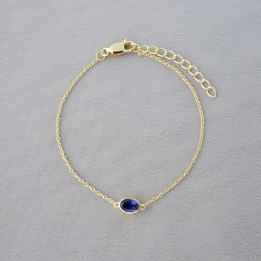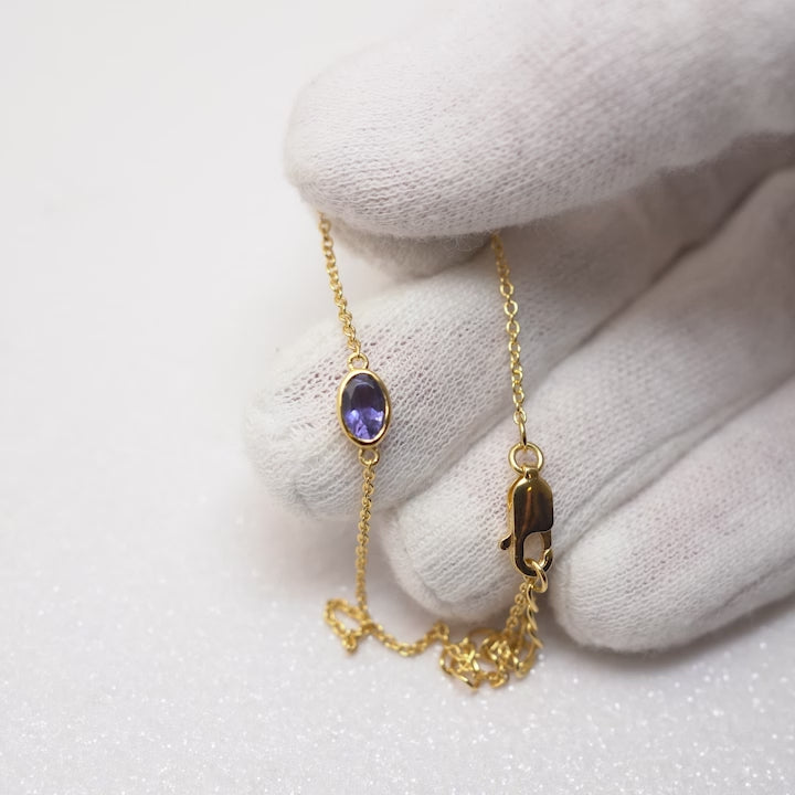 Armband med september månadssten Iolit. Blå lila kristall i guldarmband.