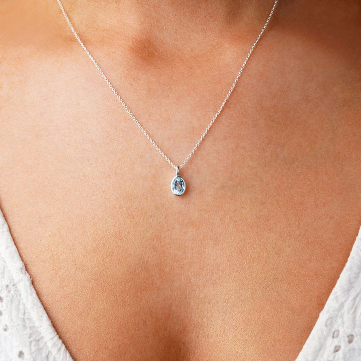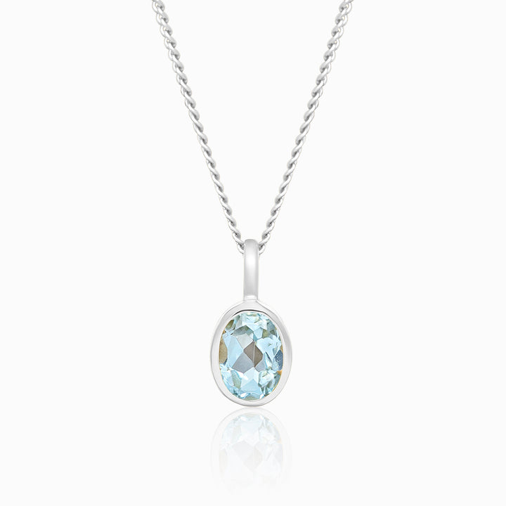 Smycke med blå sten Topas som står för kommunikation. Blå kristall Topas är månadssten för december och är perfekt att bära som halsband.