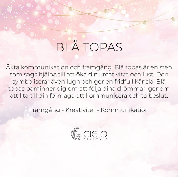 Äkta kommunikation och framgång. Blå topas är en sten som sägs hjälpa till att öka din kreativitet och lust. Den symboliserar även lugn och ger en fridfull känsla. Blå topas påminner dig om att följa dina drömmar, genom att lita till din förmåga att kommunicera och ta beslut.