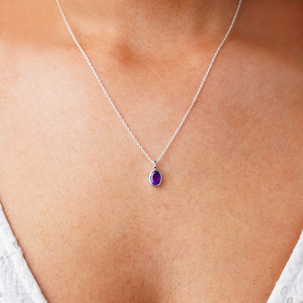 Halsband med lila sten Ametist som är en skyddande sten. Smycke med lila kristall Ametist som är månadssten för februari.