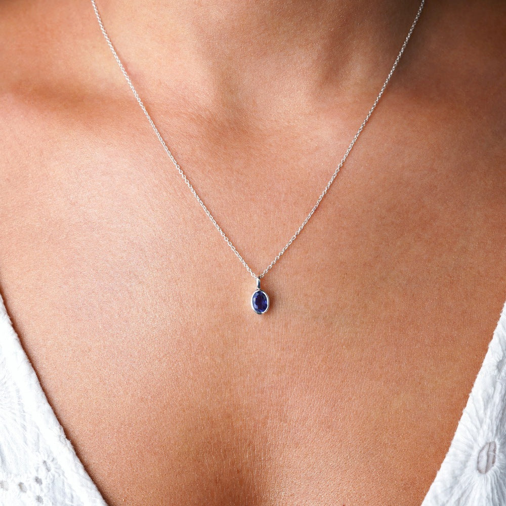 Kristallsmycke med blå, lila kristallen Iolit. September månadssten halsband med Iolit.
