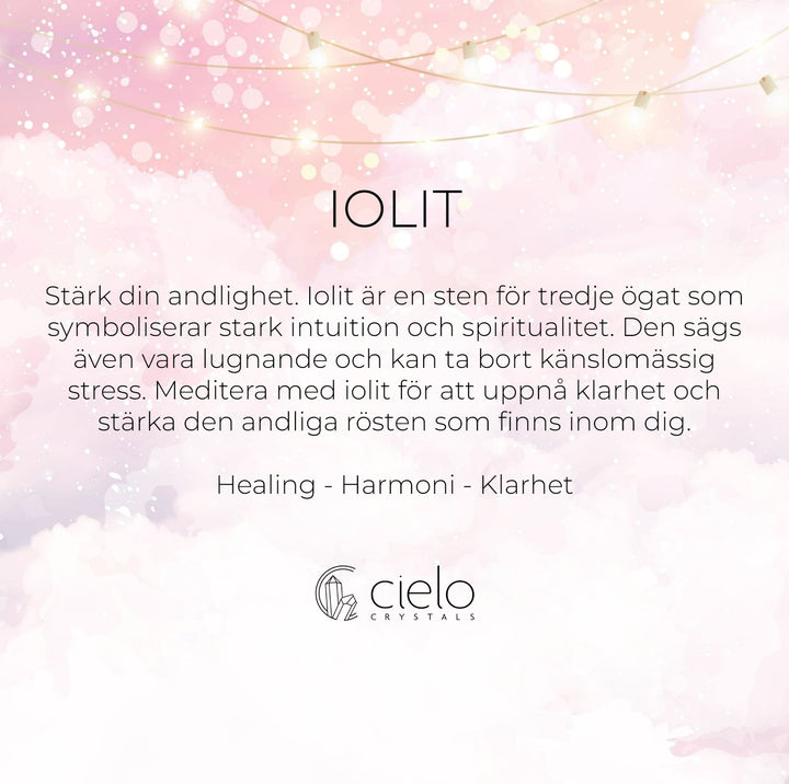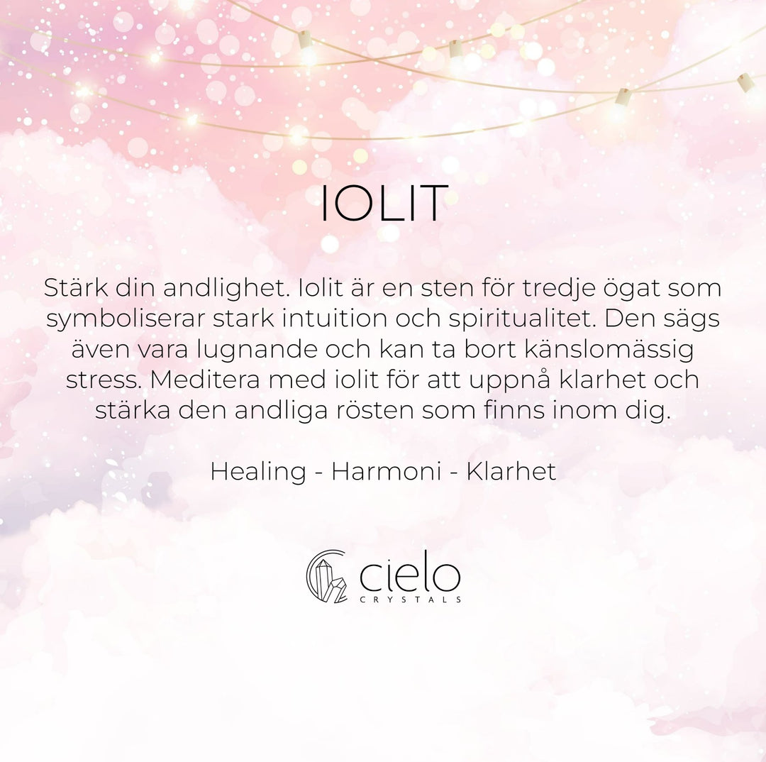 Stärk din andlighet. Iolit är en sten för tredje ögat som symboliserar starkt intution och spiritualitet. Den sägs även vara lugnande och kan ta bort känslomässig stress. Meditera med Iiolit för att uppnå klarhet och stärka den andliga rösten som finns inom dig.
