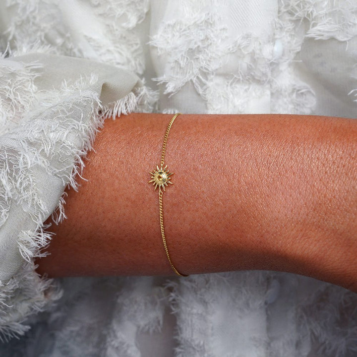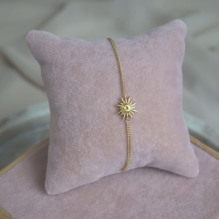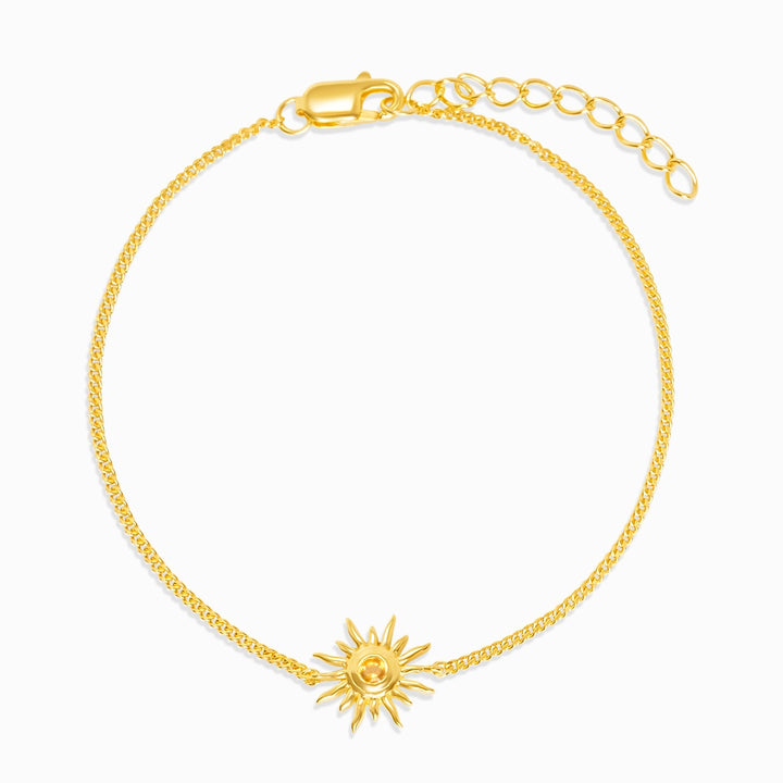 Armband Sol med Citrin i 18k Guld Vermeil. Ett kraftigt lager av äkta guld över Sterling Silver, fritt från mässing och tungmetaller. Resultatet är ett smycke som strålar av både skönhet och högvibrerande energi. Höj din vibration med denna positiva kristall som sägs locka fram känslor som lycka, glädje och tacksamhet. Solen symboliserar överflöd, värme och styrka. Bär detta armband som en påminnelse om din inre lysande kraft.