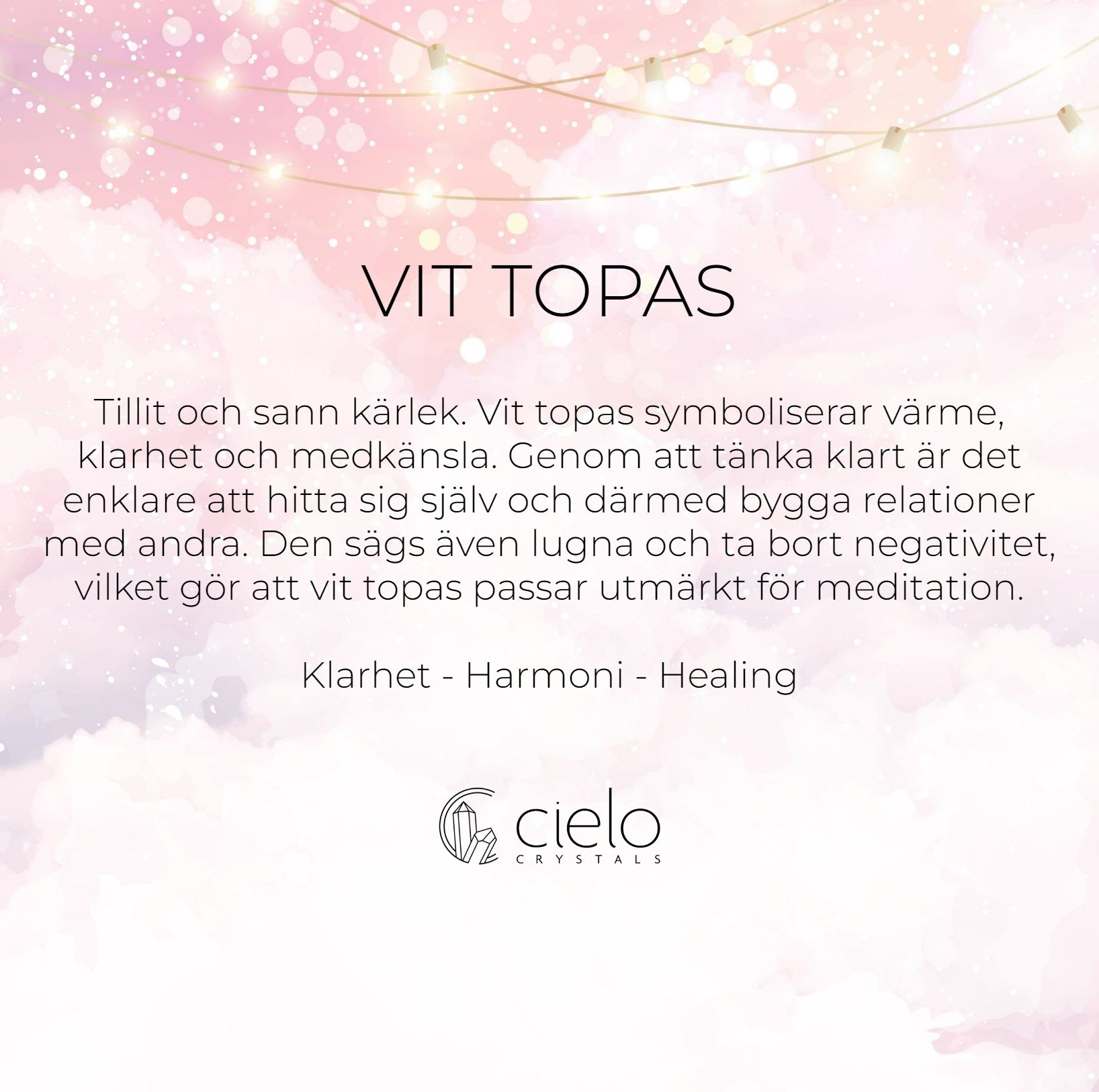 Tillit och sann kärlek. Vit topas symboliserar värme, klarhet och medkänsla. Genom att tänka klart är det enklare att hitta sig själv och därmed bygga relationer med andra. Den sägs även lugna och ta bort negativitet, vilket gör att vit topas passar utmärkt för meditation.