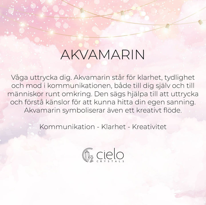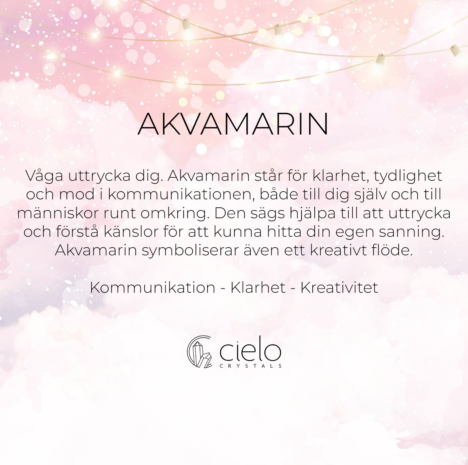 Våga uttrycka dig. Akvamarin står för klarhet, tydlighet och mod i kommunikationen, både till dig själv och till människor runt omkring. Den sägs hjälpa till att uttrycka och förstå känslor för att kunna hitta din egen sanning. Akvamarin symboliserar även ett kreativt flöde.