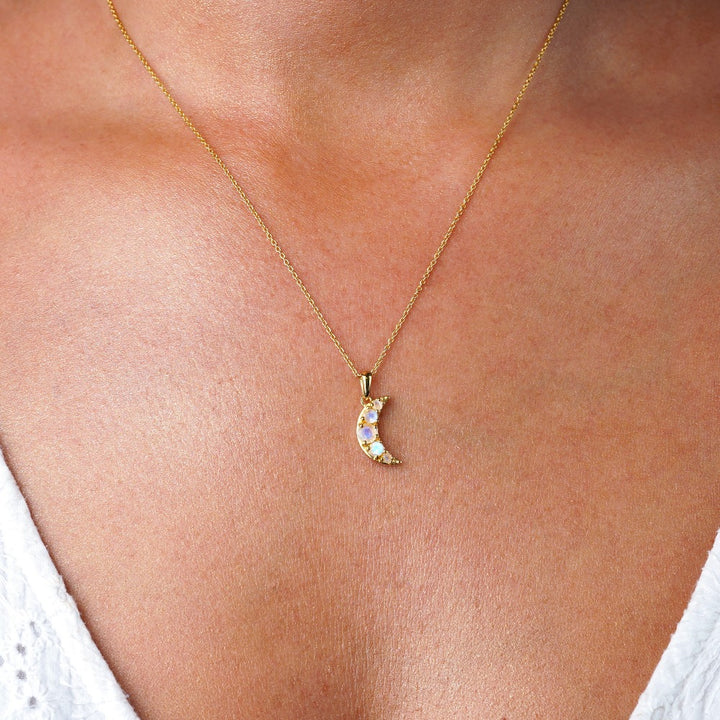 Berlock Luna Månsten i 18k Guld Vermeil. Ett kraftigt lager av äkta guld över Sterling Silver, fritt från mässing och tungmetaller. Resultatet är ett smycke som strålar av både skönhet och högvibrerande energi. Gör ett komplett halsband genom att köpa till någon av våra guldkedjor. Magiskt smycke med en halvmåne och fem kristaller av Regnbågsmånsten. Med detta smycke bär du alltid med dig din favoritkristall.