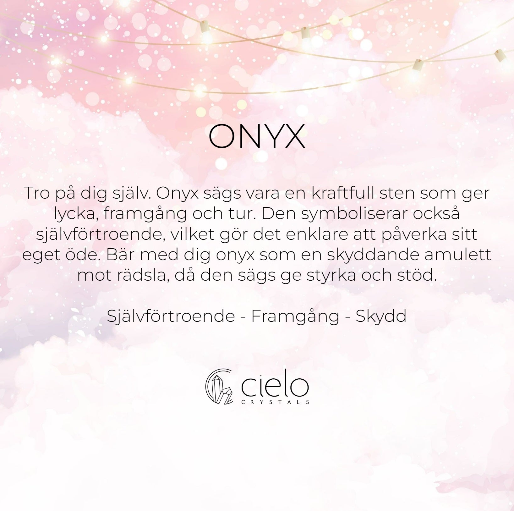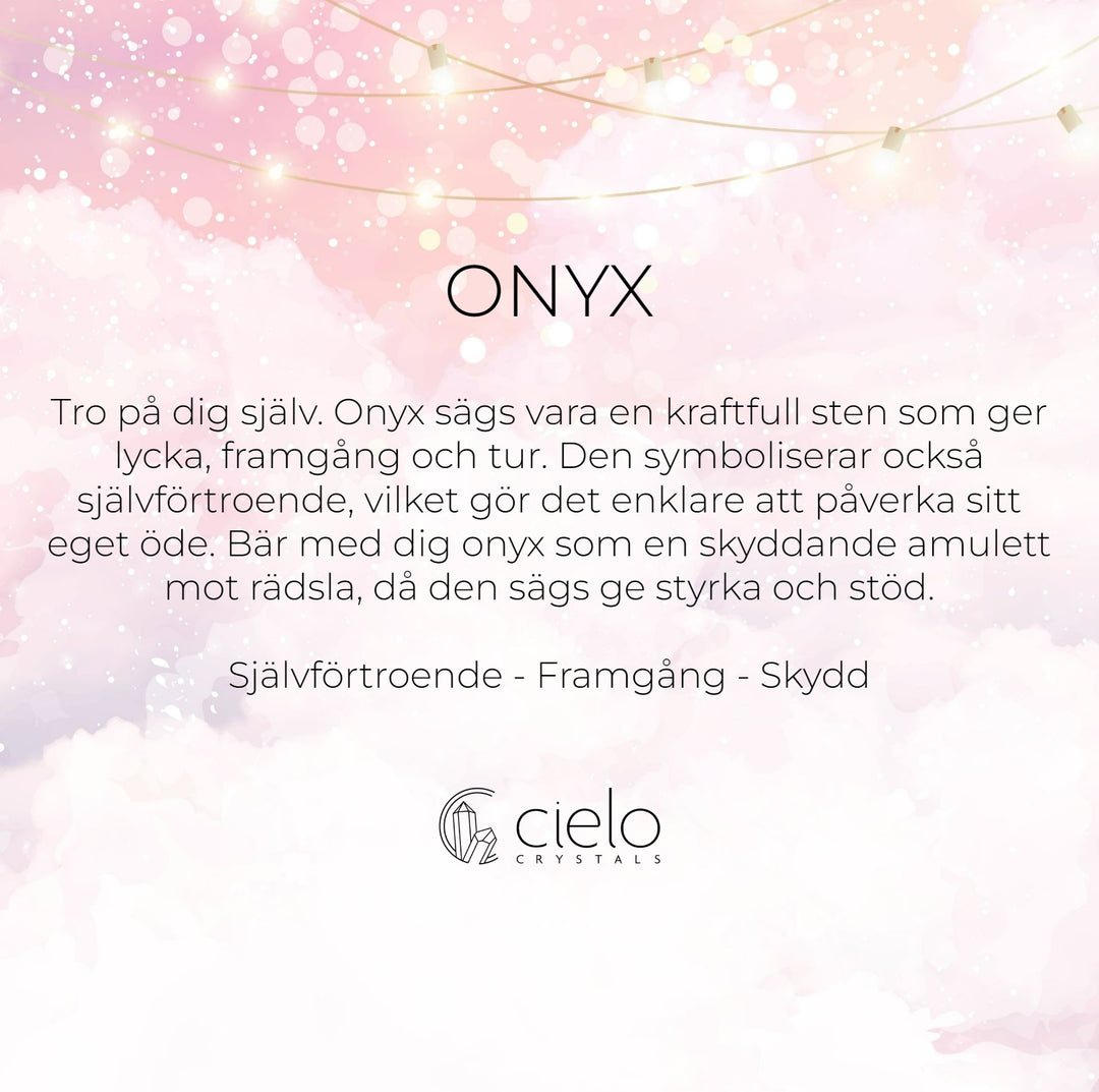Tro på dig själv. Onyx är en kraftfull sten som sägs ge lycka, framgång och tur. Den ger självförtroende och hjälper dig samtidigt att känna harmoni, vilket gör det enklare att påverka ditt eget öde. Bär onyx som amulett för att skydda mot rädsla.