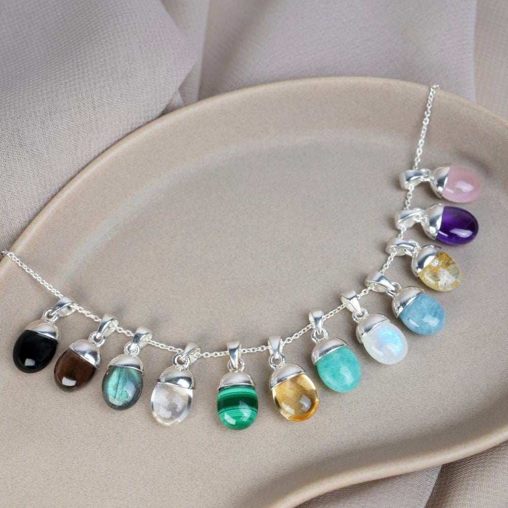 Kristaller så som Onyx, Ametist, Rosenkvarts, Malakit, Granat, Bergkristall, och Amazonit har alla olika energier och vibrationer, och vi påverkas även av färgen i stenen. Det kan vara svårt att veta vilken kristall som passar bäst för dig, men det finns inga rätt eller fel. Du kan lita på din intuition och låta slumpen avgöra. Vilken dras du till? Vilken färg tycker du är vackrast? Du kan även kolla vilken kristall som är månadssten för din födelsemånad. Eller så läser du om vilka egenskaper kristallerna symboliserar. När du är inne på en produkt finner du information om varje kristall och vi hoppas detta kan hjälpa att hitta det perfekta smycket för just dig. Kristallsmycken är också en fantastisk gåva. Vi vill att du ska känna dig nöjd med ditt köp, så alla frågor och funderingar är välkomna.